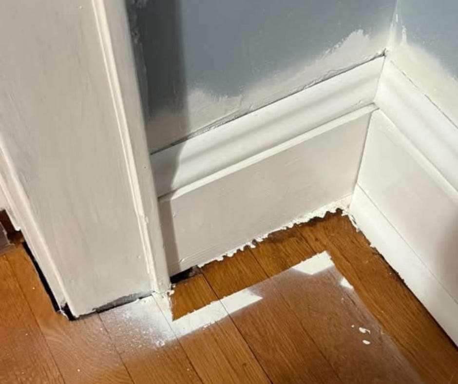 Most real estate photographers have lenses that distort reality. They also get creative with hiding “issues” by curating angles, lighting, and what to NOT have in the frame. Sometimes they outright photoshop those “issues” as if we were not going to notice the 5-story apartment building on the other side of the privacy fence? One house that looked lovely in photos was an utter shitshow—from the garage door that had about a foot of damp, spongy wood at the bottom, to the sagging skylights held in place by a single, determined, ancient bead of moldy caulk. After wrestling open the front door from its dry-rotted seals, we were greeted by stale air that was colder than the temperature outside. Witch’s tit cold. Out of curiosity, we twisted the sink faucet handle and indeed the house pipes were frozen solid. Even the pool had a layer of leaf-filled icebergs like a gross, gigantic version of the decorative fruit filled ones in a party punchbowl. Gag me. Fresh paint, the listing said. Yes indeed, fresh paint everywhere. I am not exaggerating when I tell you that someone took a spray gun and raw-dog painted the trim. Every floor (hardwood, tile, or carpet) and every wall and every ceiling had dark greige hazy ombre “design elements.” All for the bargain price of $1.1M.